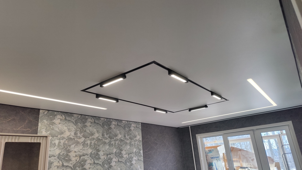 Теневые натяжные потолки создают эффект «плавающего» потолка, где края полотна скрыты в специальном профиле. В частности, это позволяет создать гладкую, аккуратную поверхность без видимых швов. Таким образом, Такой потолок визуально увеличивает пространство, придавая ему легкость и глубину. Он отлично подходит для современных интерьеров и гармонично смотрится как в жилых, так и в коммерческих помещениях.